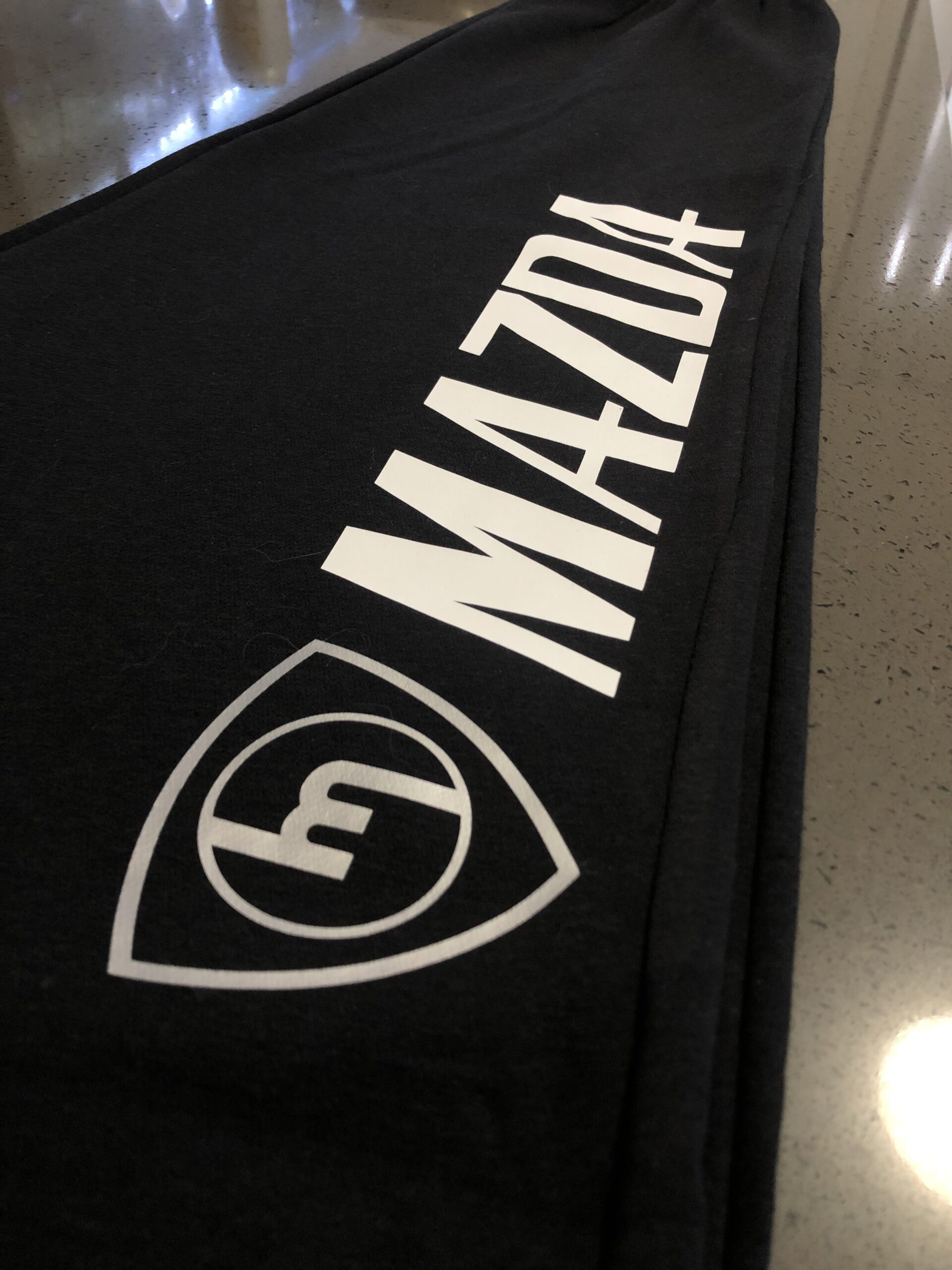 Black track pants with Silver M white Mazda
