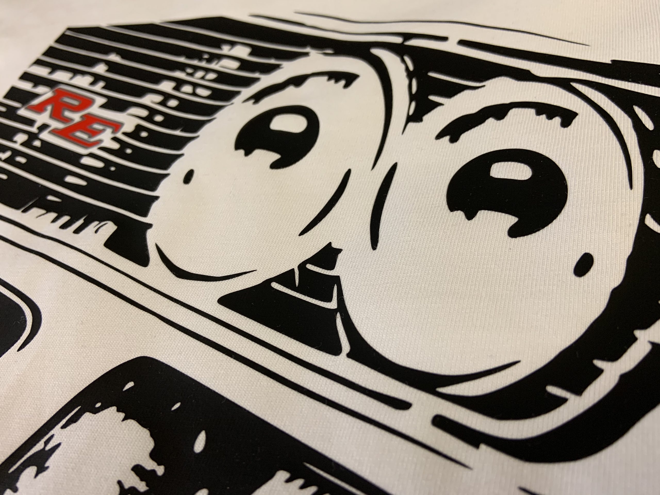 White tee with black,red,silver details.